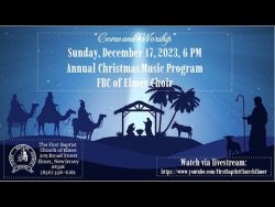 Come, Thou Long Expected Jesus – Arr. by Dan Forrest December 20, 2023 Read Video 12/17/23 FBC of Elmer Choir Copyright License A 68900 7/31/2024 Streaming License A CSPL 149506 12/31/2023 SHARE ON Twitter Facebook Buffer LinkedIn Pin It Leave a Reply Cancel replyYour email address will not be published. Required fields are marked *Comment * Name * Email * Website Δ Continue Reading Angels’ Carol – John Rutter December 24, 2023 AM Isaiah 42:8-12, “God’s Promise of His Glory”