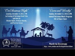 December 10, 2023 PM – On Christmas Night, Music Concert December 9, 2023 Read Video Eleanor Bailey, Bethany Hanson, and Patricia Turner, Vocalists Copyright License A 68900 7/31/2024 Streaming License A CSPL 149506 12/31/2023 SHARE ON Twitter Facebook Buffer LinkedIn Pin It Leave a Reply Cancel replyYour email address will not be published. Required fields are marked *Comment * Name * Email * Website Δ Continue Reading December 6, 2023: Wednesday night Bible Study December 10, 2023 Sunday AM – Sunday School